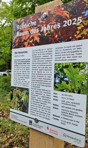 Die Roteiche stammt ursprünglich aus Nordamerika und ist wegen ihrer auffälligen roten Herbstfärbung besonders bekannt. Weitere Informationen zur Baumart und zum Baum des Jahres gibt es auf der Website der Dr. Silvius Wodarz Stiftung: baum-des-jahres.de.