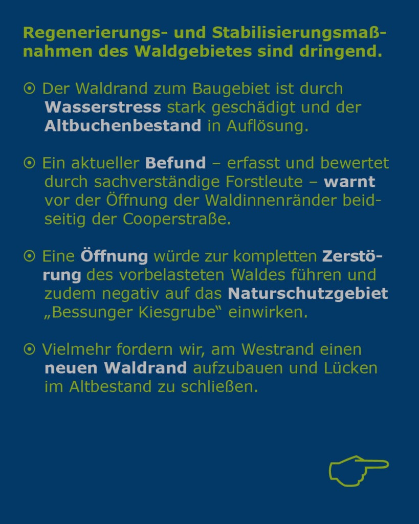 - Sie gefährdet die notwendige Renaturierung des nördlich der Cooperstraße liegenden Waldgebietes.
