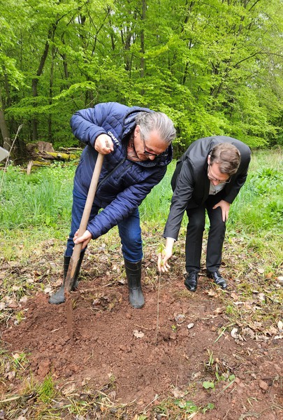 Darmstadt. Bei trockenem Frühlingswetter haben Landrat Klaus Peter Schellhaas und Darmstadts Oberbürgermeister Hanno Benz gemeinsam mit einer Gruppe von Jagdhornbläsern aus Groß-Gerau die Roteiche (Quercus rubra) als Baum des Jahres 2025 in der Jahresbaumgalerie an der Feldschneise gepflanzt.