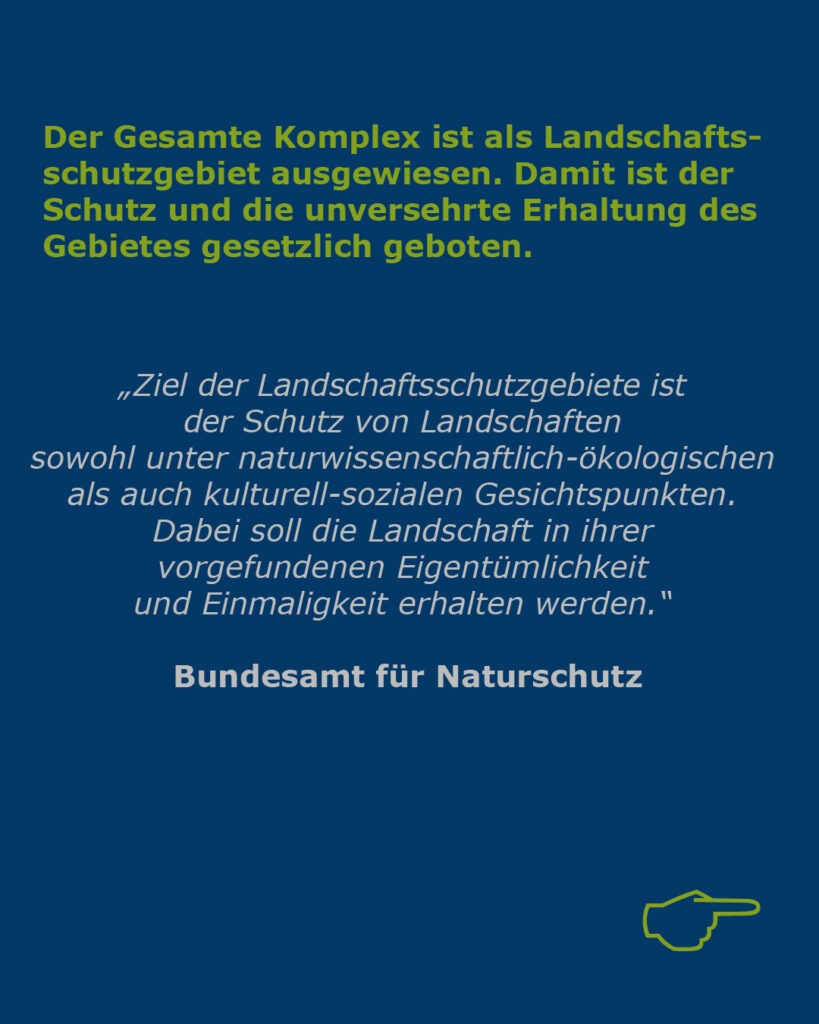 - Sie ist ein Verstoß gegen mehrere Tatbestände der Landschaftsschutzverordnung (Schutz der Naturgüter, Eingriff in die Leistungsfähigkeit des Naturhaushalts, Störung des Landschaftsbildes)