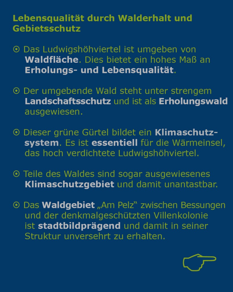 - Sie gefährdet die Substanz des Klimaschutzwaldes mit Wirkung auf des Ludwigshöhviertel (LHV) und das Naturschutzgebiet Bessunger Kiesgrube.